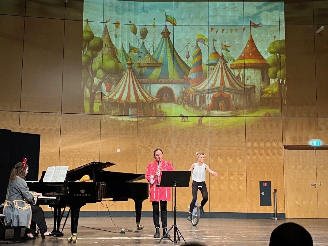 Auf einer musikalischen Reise durch die verschiedenen Bilder haben wir nicht nur einen Flügel, eine Klarinette, ein Cello und eine Querflöte gehört, sondern auch die Ente Quitschie zum Schluss tatsächlich wieder gefunden.