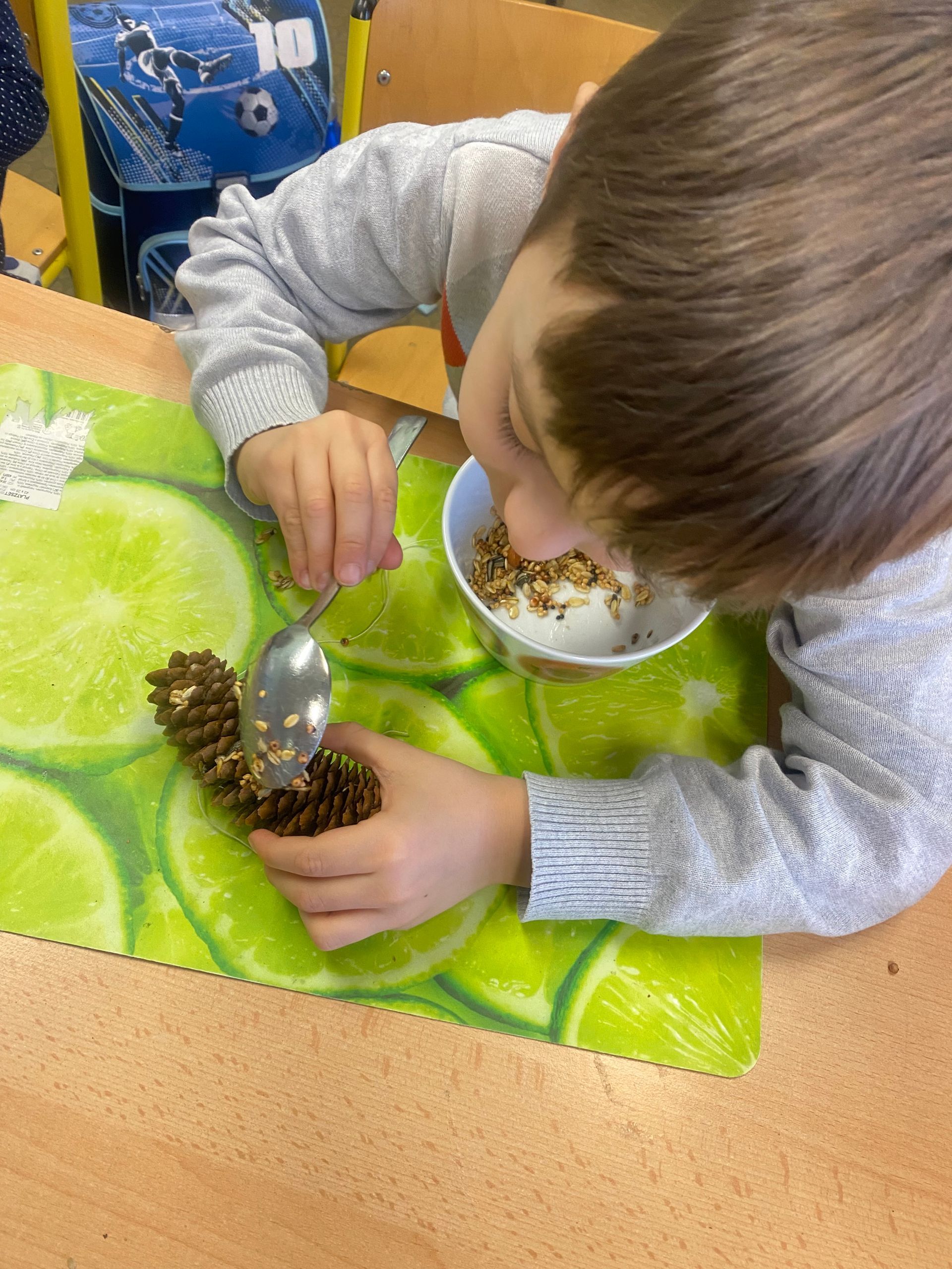 Ein paar Vögel können aber auch hierbleiben. Diese Standvögel taten uns ziemlich leid. Damit es ihnen im kalten Winter etwas besser geht, haben wir aus Kokosfett, Nüssen, Kernen und Tannenzapfern Vogelfutter hergestellt. Auf verschiedenen Balkonen, in Gärtnern und Höfen wartet jetzt leckeres Essen auf die Standvögel.