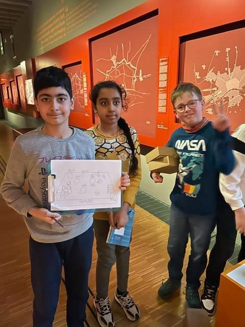 Wir hatten heute einen tollen Museumsbesuch im Jungen Museum Frankfurt. Begleitend zu unseren Referaten zur Geschichte und Entwicklung Frankfurts erhielten wir heute eine Führung zur Stadtentwicklung Frankfurts. Die Führung war spannend und hat viel Spaß gemacht. Zum Abschluss der Führung haben wir in Gruppenarbeit „unsere“ Stadt Frankfurt gebaut. Wir durften, nach vorheriger Planung auf dem Papier, mit allen Arbeitsgruppen (Gewässer, Grünflächen, Ernährung, Bau, Straßen) unsere Stadt bauen. Es hat großen Spaß gemacht, obwohl es nicht leicht war eine Einigung zu erzielen.
