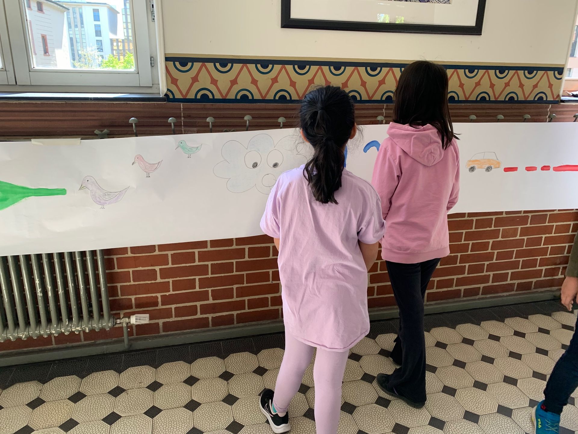 In der Projektwoche 2025 hat sich der 4. Jahrgang künstlerisch mit dem Thema Schule ohne Rassisamus - Schule mit Courage auseinandergesetzt. Dabei haben sie in Kleingruppen vier Schultage mit Acylfarben auf großformatigen Leinwänden gemalt. Ihre Leitideen haben die Kinder in unterschiedlichen Motiven, Farben und Bildkompositionen ausgedrückt. Es wurde viel gelacht, diskutiert, gesprochen und gepinselt. Am Ende sind wundervolle Kunstwerke entstanden, die in Kürze in Form einer Dauerausstellung im Schulgebäude ausgestellt werden. Jahrgang 4 mit Herr Jendrosch und Frau Richter