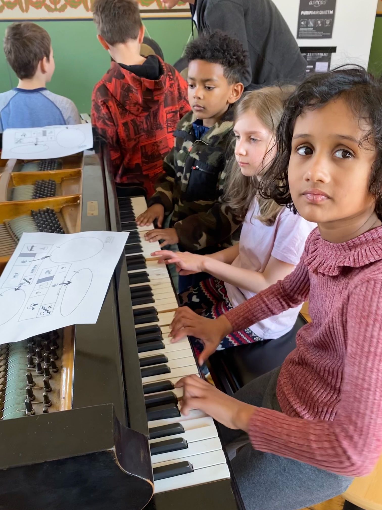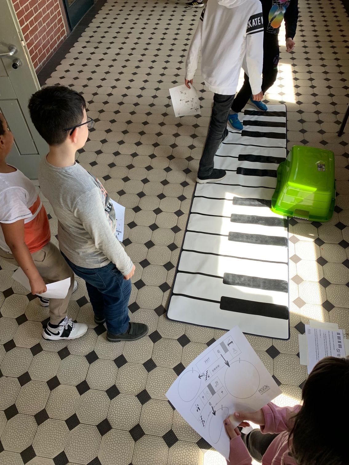 Manche haben auch zur Musik gemalt. Es gab auch ein Hör-Memory und eine Boden-Tastatur. Dort sind wir zwischen den Tönen gehüpft. Wir konnten alles ausprobieren außer die Keyboards.