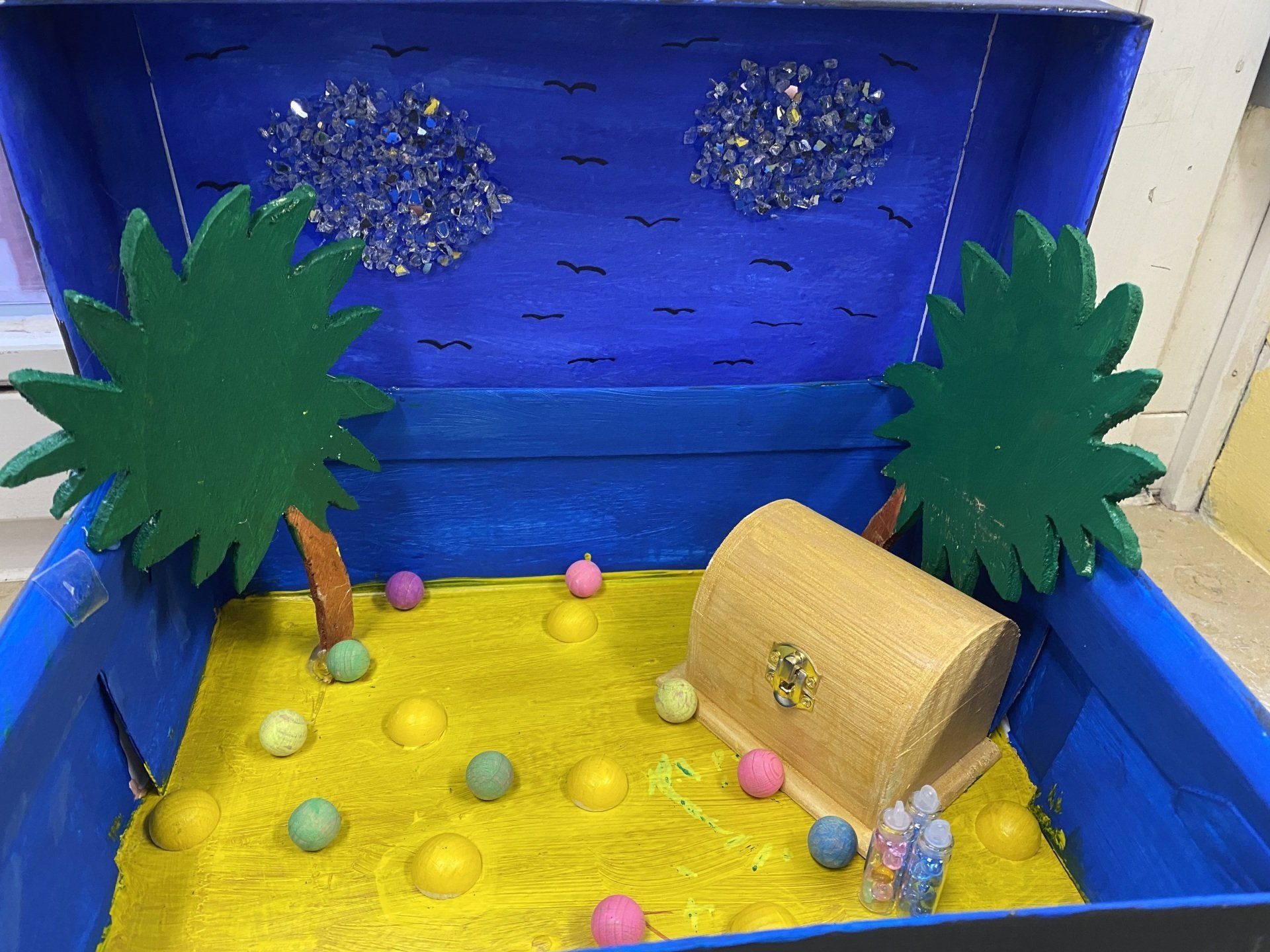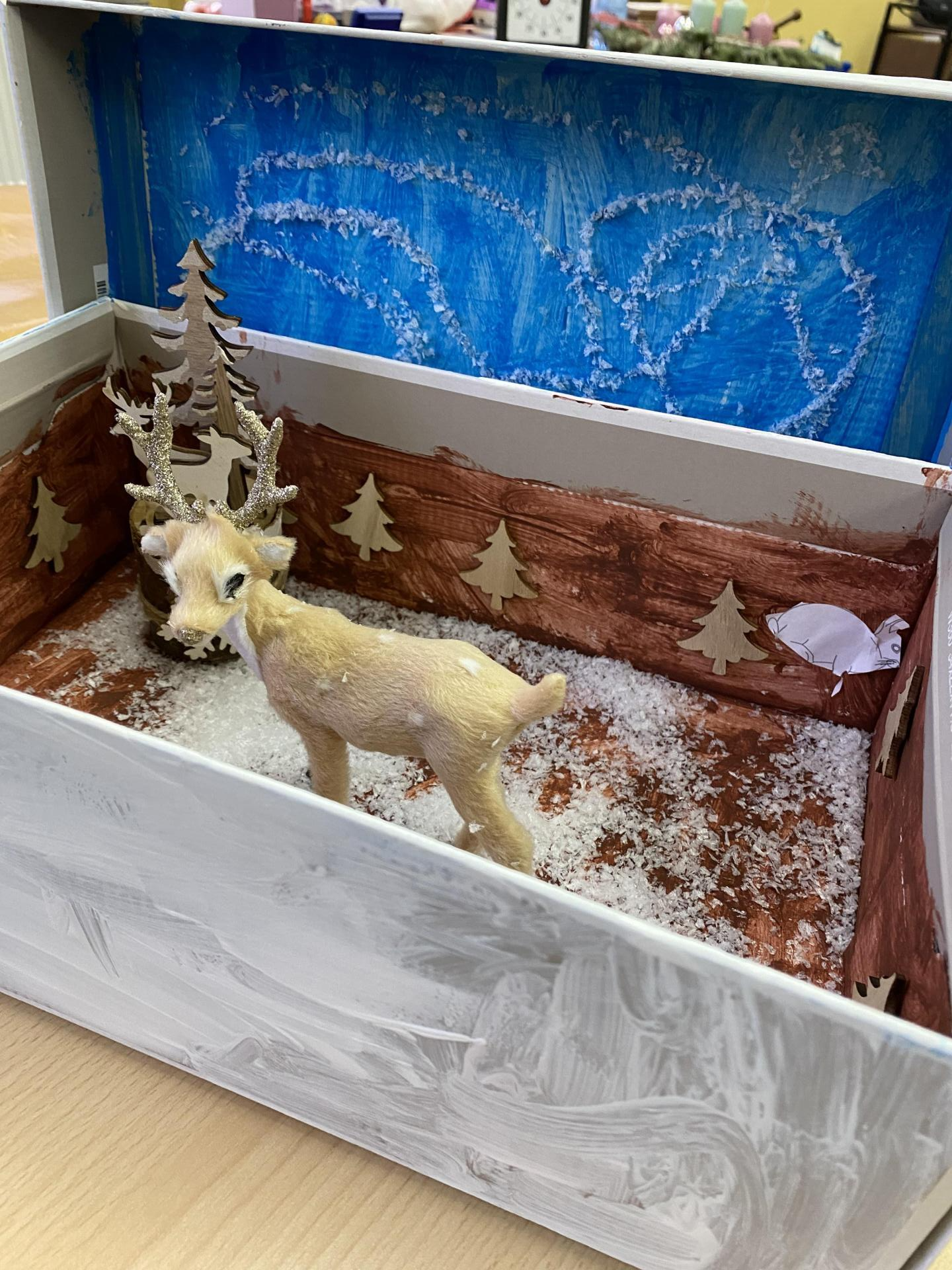 Die Kinder der Klasse 4d haben in der Schreibwerkstatt „Geschichten im Schuhkarton“ erstellt. Zu jeder Geschichte wurde ein Schuhkarton gestaltet. Außerdem haben sich die Kinder zu jeder Geschichte einen passenden Reim überlegt. Die Schuhkartongeschichten werden aktuell im Holzhausenschlösschen ausgestellt.