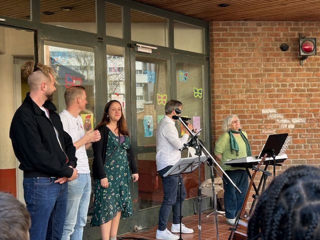 Zum Einläuten der Osterferien fand am 4.April in der 3.Stunde das Frühlingssingen aller Klassen der Weißfrauenschule auf dem Schulhof statt. Frau Reith hatte alles wunderbar organisiert und alle Klassen hatten die Lieder im Vorfeld geübt. Gemeinsam mit musikalischer Verstärkung durch Frau Vock, Herrn Jeffreys und Herrn Becker trällerten die Kinder der Weißfrauenschule die Frühlingslieder. Es machte großen Spaß zusammen zu singen. Danke an Frau Reith und alle Musikanten.