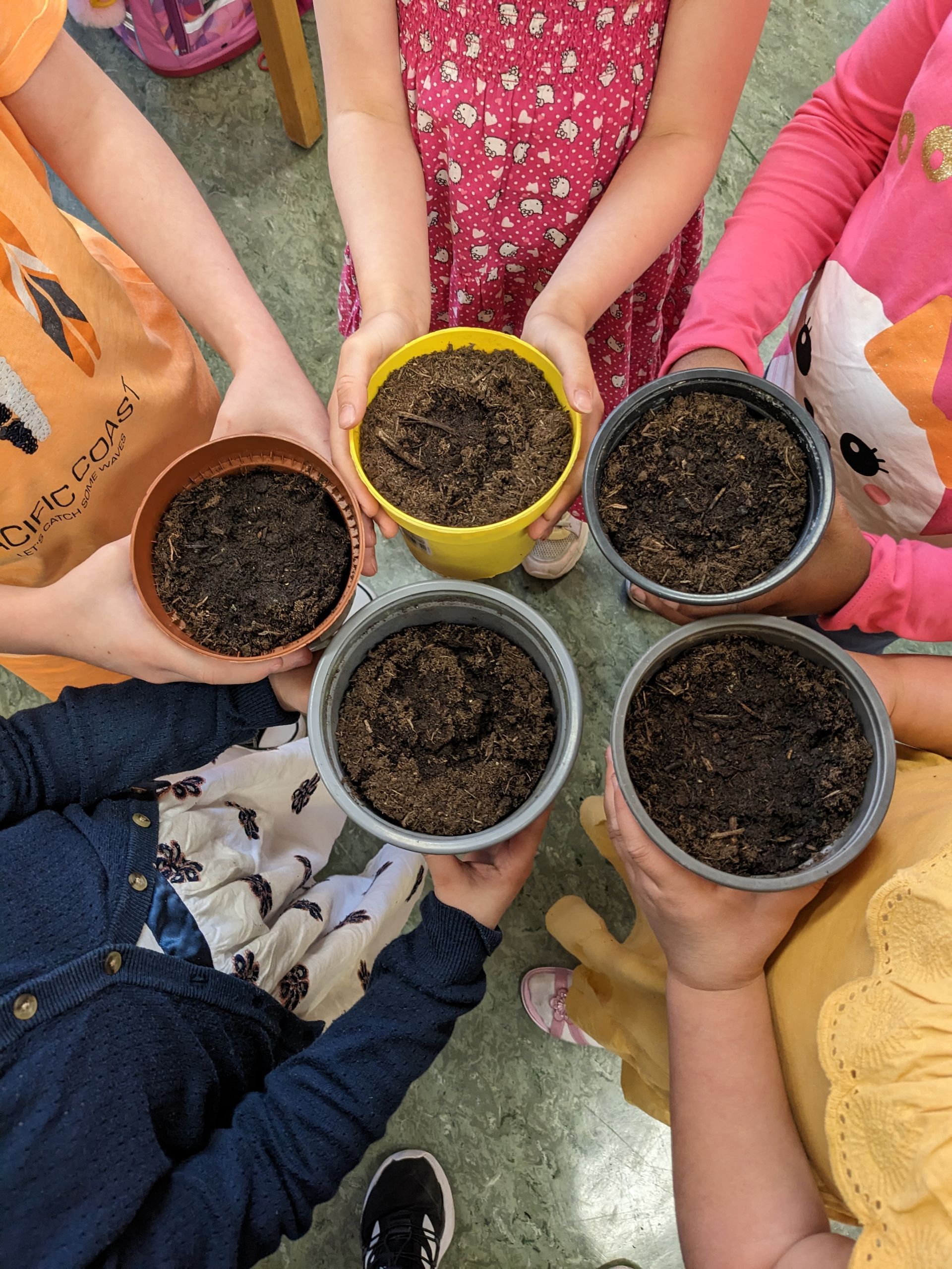 Alle Kinder haben Erde in die Blumentöpfe gefüllt.