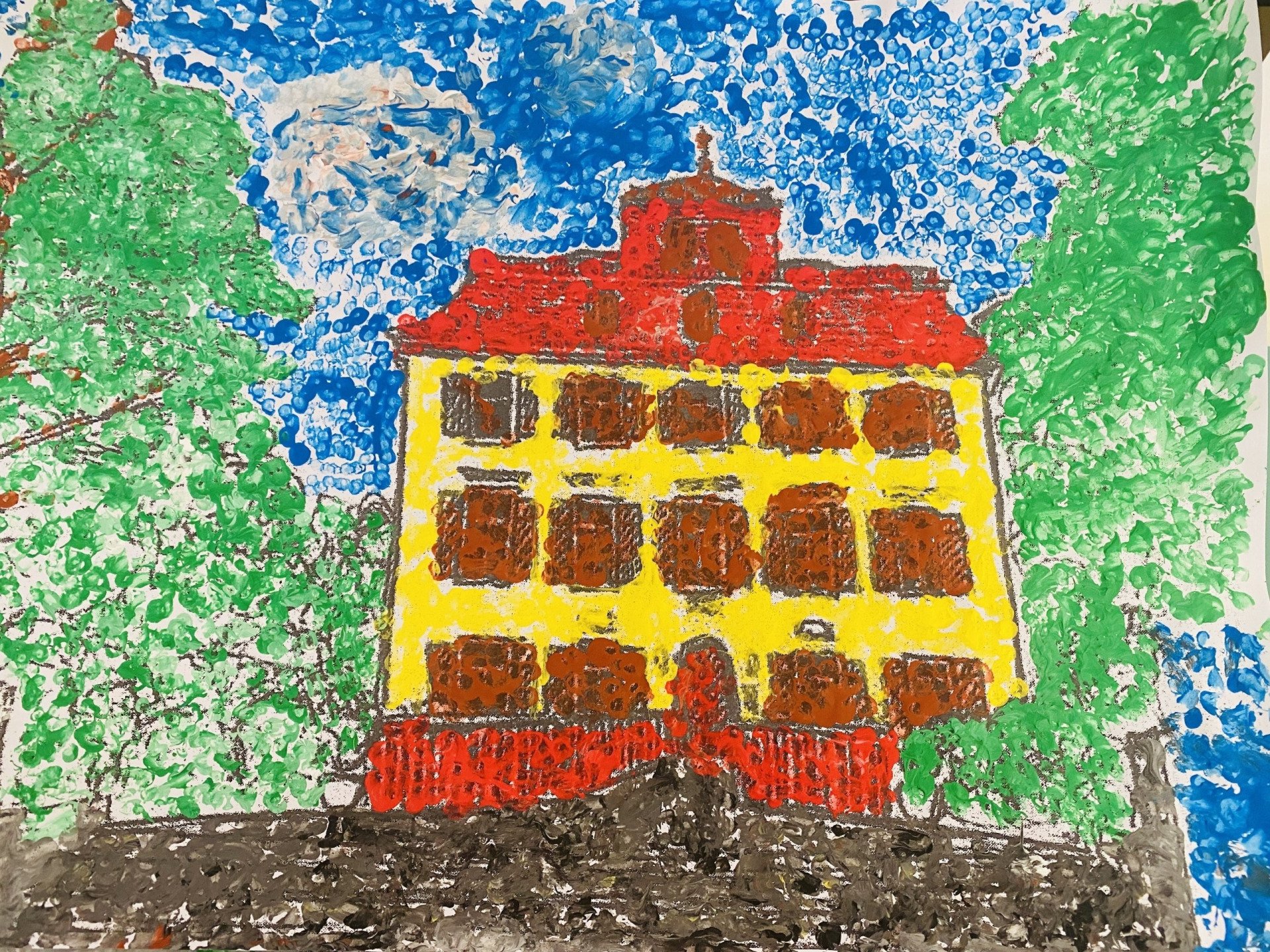 Beim ersten Termin konnten wir das Holzhausenschlösschen wie Detektive erkunden und lernten Clemens und Irina kennen, die die Schreibwerkstatt gestalten. Als Hausaufgabe sollten wir Bilder des Holzhausenschlösschens malen und zum nächsten Termin mitbringen.