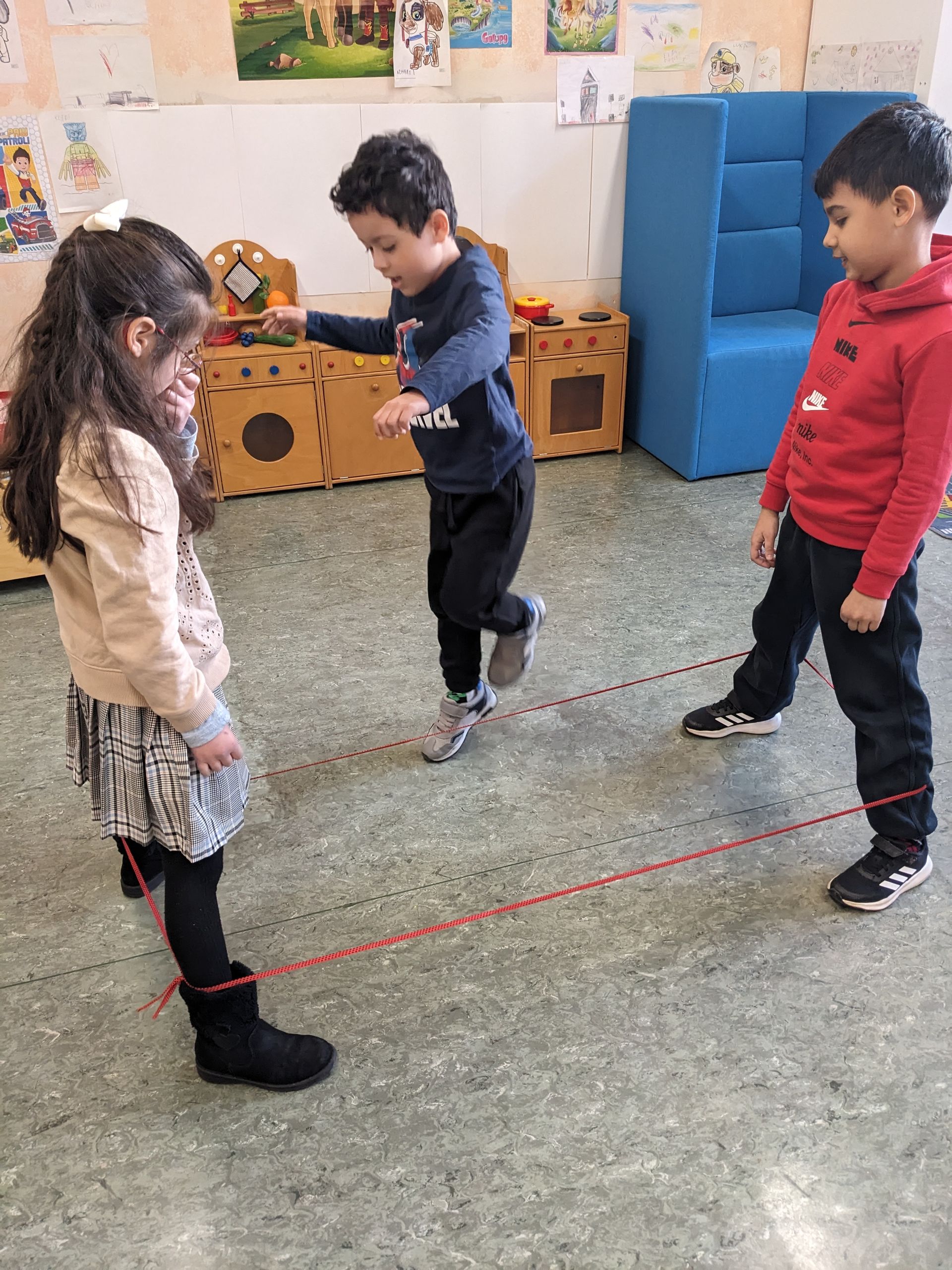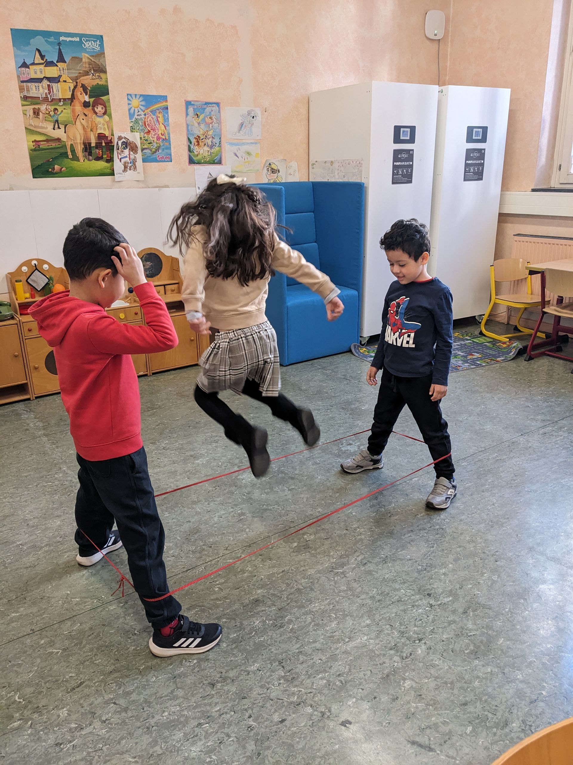 In der Vorklasse 1 hieß es heute: Holt das Gummitwist raus! Wir haben verschiedene Sprungtechniken ausprobiert und konnten uns gegenseitig unterstützen, denn alleine kann niemand von uns Gummitwist springen. Allen in der Vorklasse 1 hat es großen Spaß gemacht und wir wollen das Gummitwist jetzt öfter nutzen.