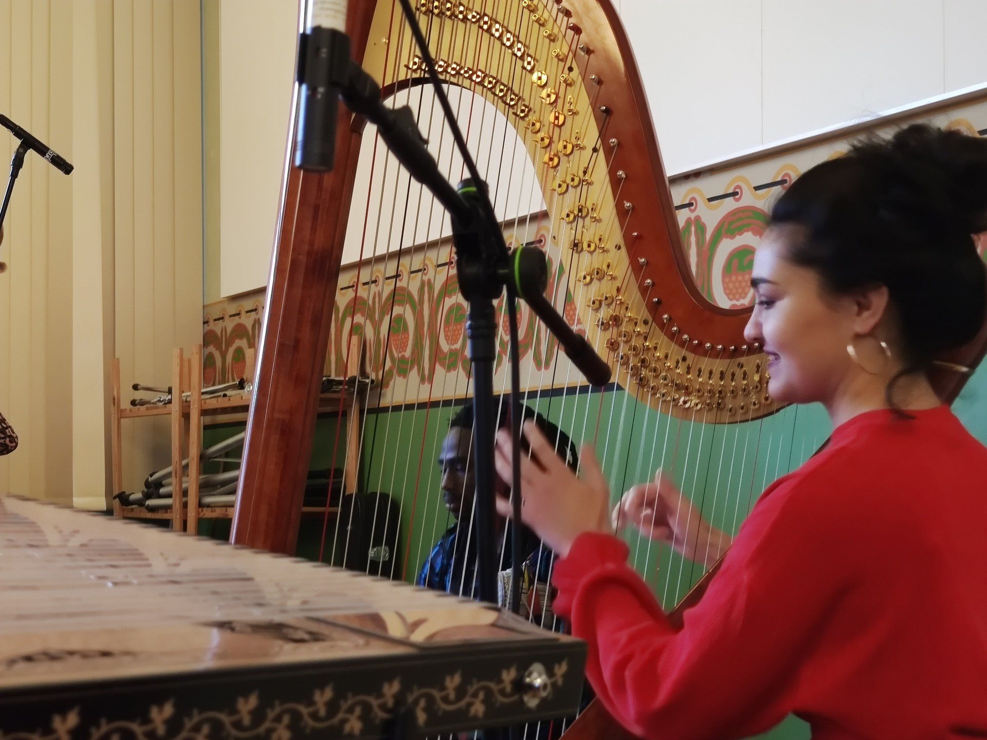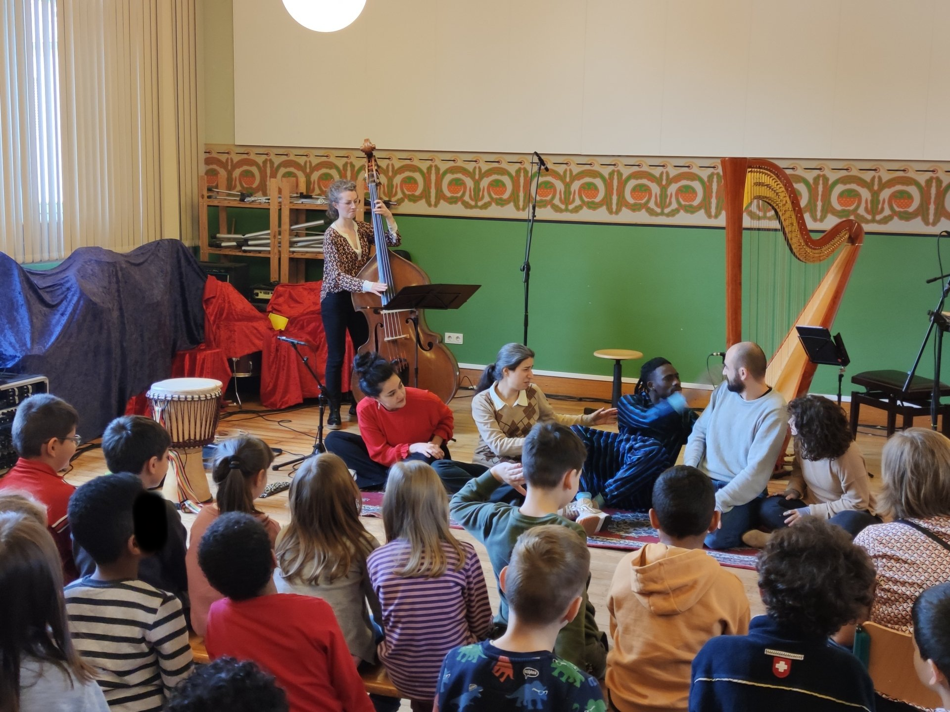 und Mitarbeiter:innen von UBS. Gemeinsam gingen wir in unsere Aula, wo viele Instrumente standen. Es gab eine Harfe und Klarinette und allerlei Instrumente, die wir noch nie gesehen und gehört hatten.