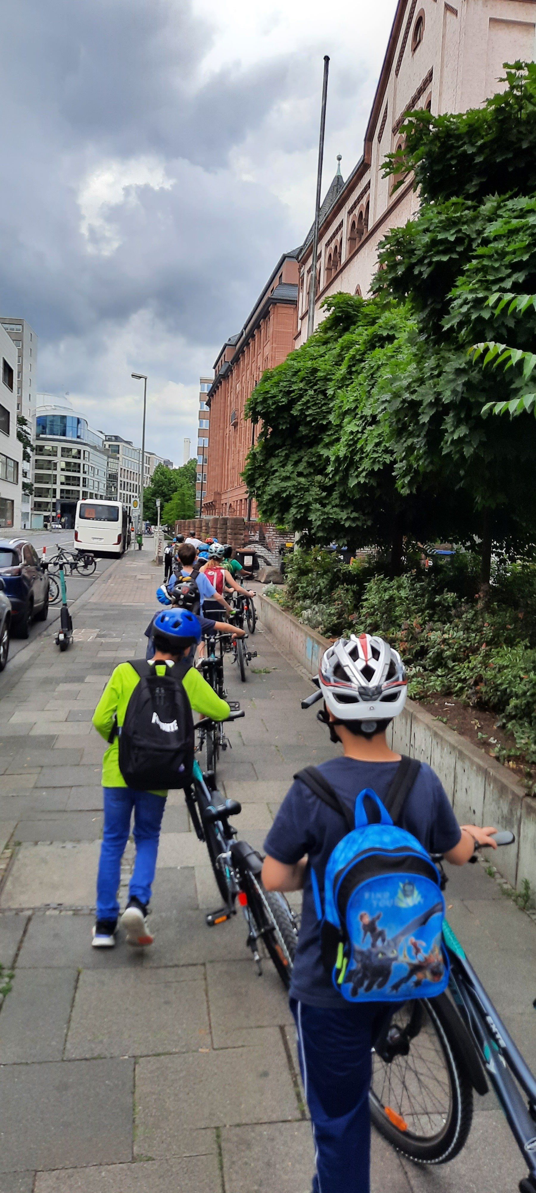 Wir sind mit dem Fahrrad am Main entlanggefahren. Unser Ziel war der Hafenpark im Osten von Frankfurt. Dort haben wir dann Pause auf dem Spielplatz gemacht. Manche haben auf dem Spielplatz Fußball gespielt. Es gab einen Basketballplatz, einige Riesenschaukeln, einen Skatepark und einen Fußballplatz. Manche sind auch geklettert. Das hat uns Spaß gemacht.